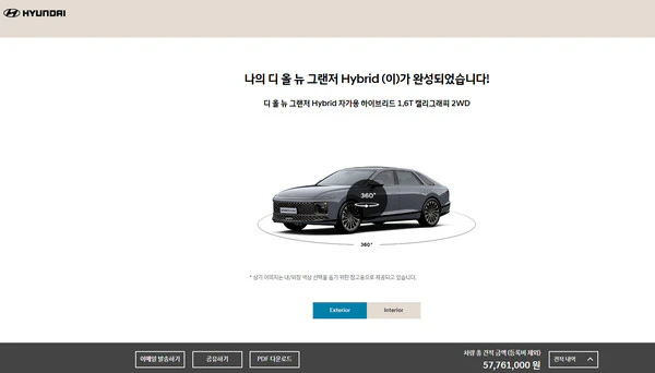 현대자동차 공식 홈페이지에서는 사용자 맞춤형 견적을 통해 개인의 취향과 필요에 맞는 차량을 구성할 수 있습니다. 원하는 모델과 옵션, 색상을 선택해 나만의 차를 만들어보세요.